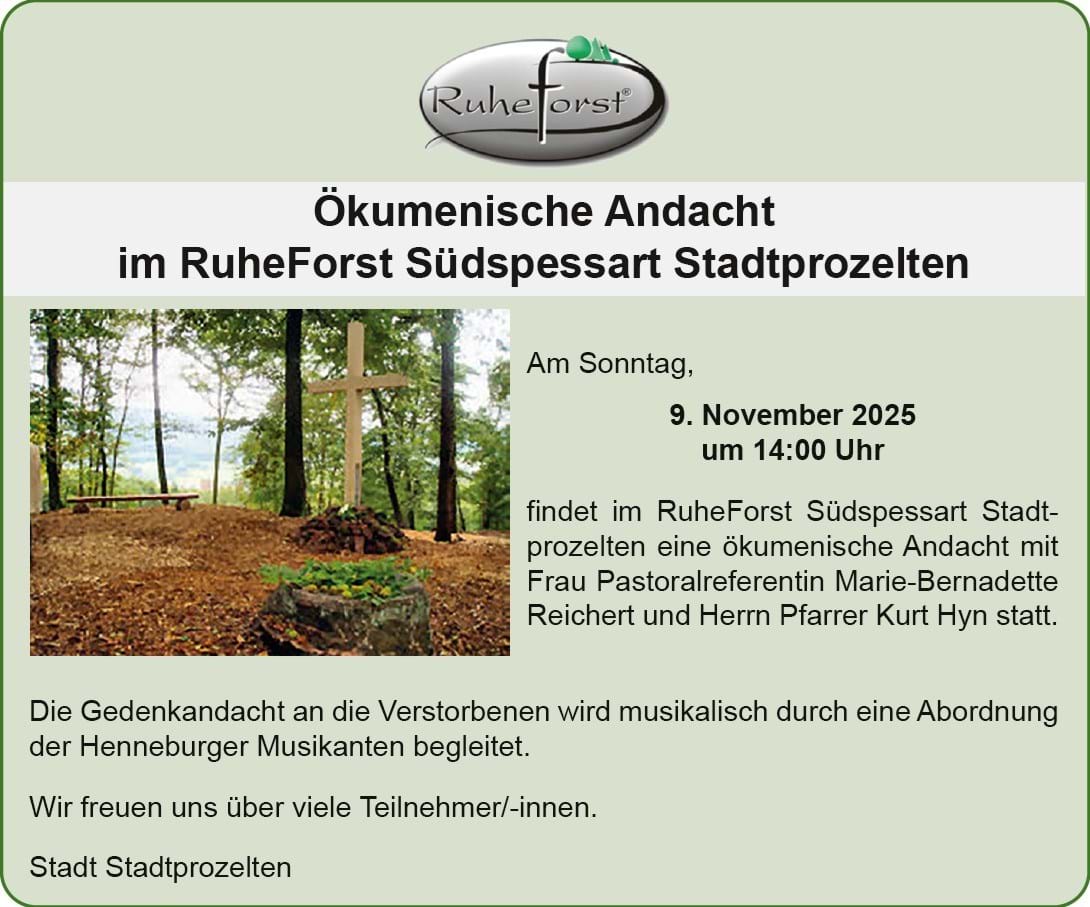 Am Sonntag, 9. November 2025 um 14 Uhr findet im RuheForst Südspessart Stadtprozelten eine ökumenische Andacht mit Frau Pastoralreferentin Marie-Bernadette Reichert und Herrn Pfarrer Kurt Hyn statt.